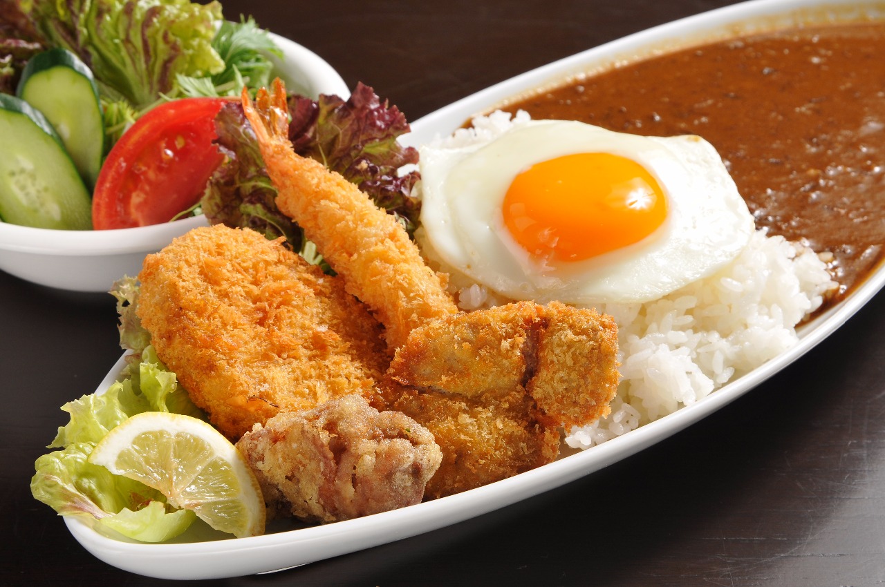 満足カレー(トッピング全部のせ!) 1,000円 エビフライ、目玉焼き、竜田揚げ、ヘレカツ、コロッケ各1個