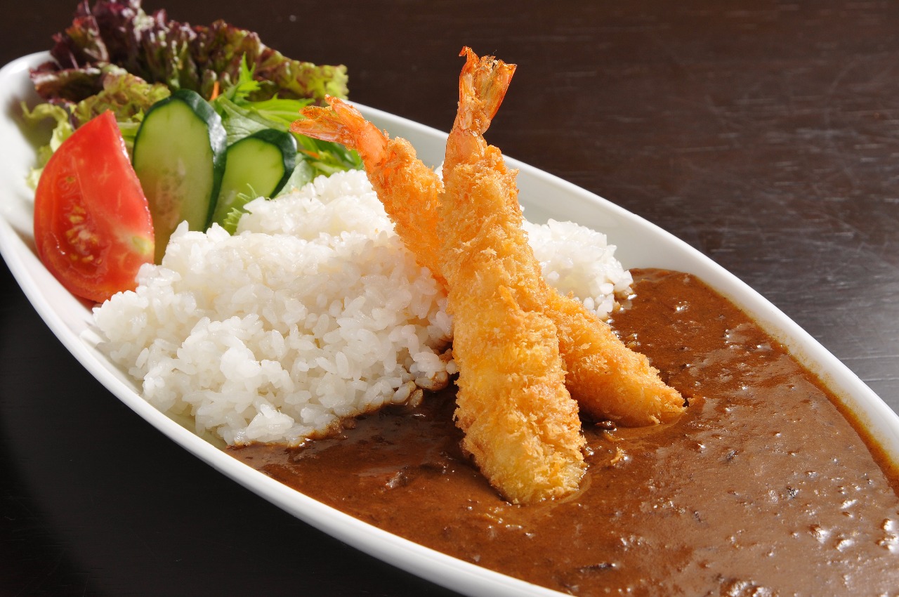 エビフライカレー 850円 女子に人気の大きなエビフライが2尾。
