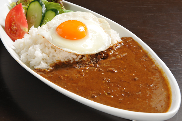 目玉焼きカレー 750円 地元養鶏場の新鮮タマゴの目玉焼きです。
